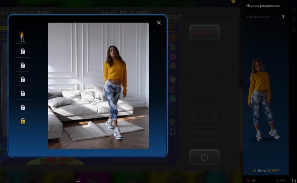 - Игра на раздевание (18+) — позволяет раздевать красивую девушку как бонус к выигрышу